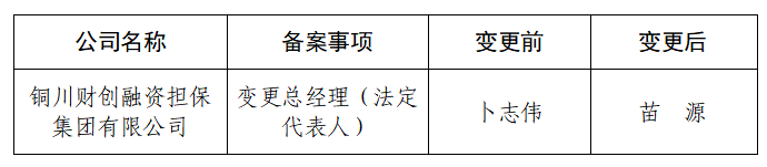 根据《融资担保公司监督管理条例》(国务院令第683号)及《陕西省地方金融监督管理局 陕西省市场监督管理局关于融资担保公司有关变更事项备案程序的通知》(陕金发〔2023〕52号)等有关规定,现对如下事项予以备案: